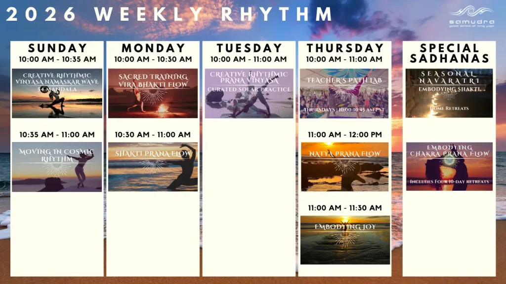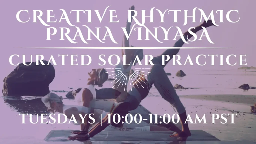 - embodiment through the All-Levels “roots of prana flow — namaskar of the week” – a sacred rhythm that connects you to natural cycles by awakening and harmonizing your whole-body system through fluid intelligence.